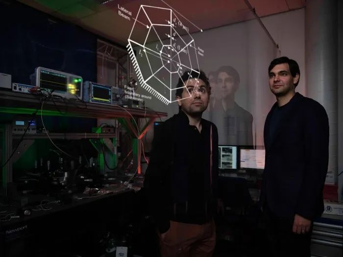 受自然界蜘蛛网的启发和机器学习的指导,理查德·诺特(左)和米格尔·贝萨(右)在实验室里展示了一种新型的传感器。