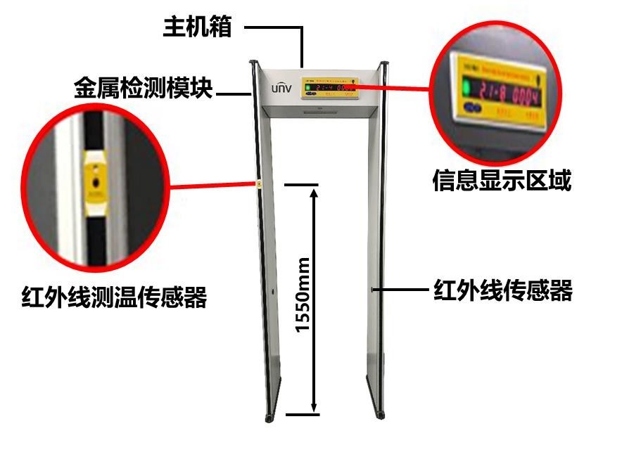 UUSS-SC100A-TM 测温型金属安检门是多功能的安检设备,既可用于检测人员是否携带金属违禁品,也可检测体温是否异常, 适合用于人流密集场所管控。